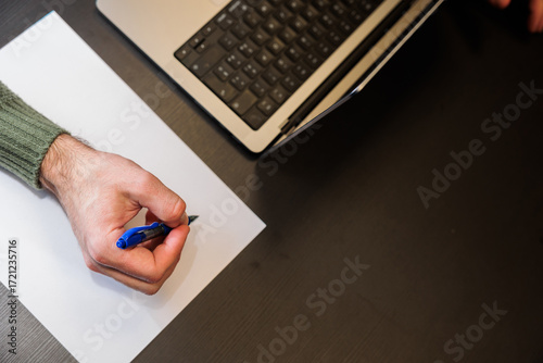 concetti sul lavoro in ufficio, stare seduti alla scrivania, utilizzare un computer e prendere appunti con carta e penna