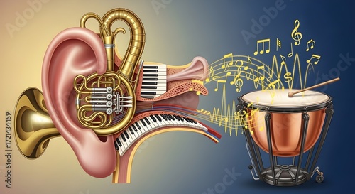 Human Ear and Musical Instruments Interconnected with Sound Waves Emitting from Drum Close-up View