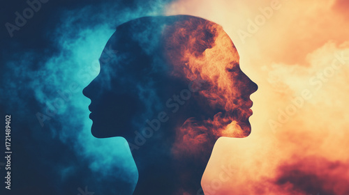 Intriguing dual face profile, symbolizing duality, emotions, and inner conflict, perfect for psychology, self-discovery, and mental health concepts