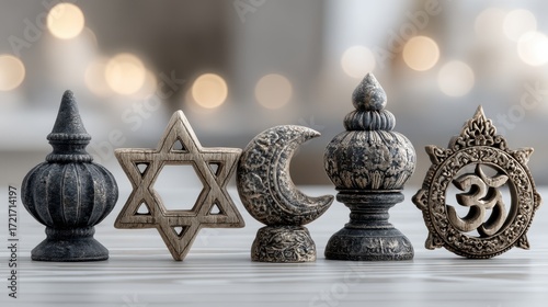 Decorative metallic symbols representing diverse religions and cultures displayed on a wooden surface with blurred lights in the background.