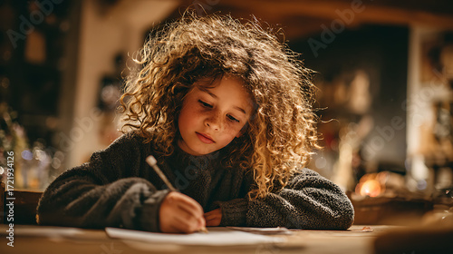 creative young girl concentrating on writing in cozy indoor study scene curly hair thoughtful expression lifestyle education portrait highlighting learning moment