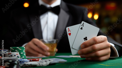 Man in a tuxedo confidently holding a pair of aces in a poker game.