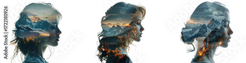 Double exposure portraits of womens profiles superimposed with mountain and sky landscapes isolated on transparent background