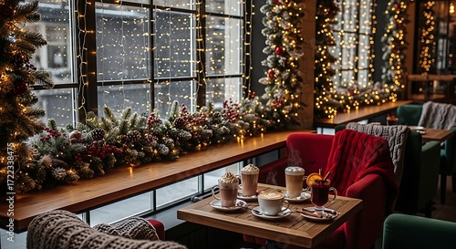 Cozy christmas atmosphere in a cafe with decorated windows, warm lights, and hot drinks on a table, creating a festive and inviting scene