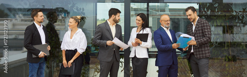 Business people meeting outdoors by office window for professional discussion. Team members talking about documents and ideas, employees group standing together and discussing future project