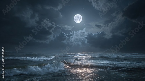 A serene and dramatic seascape under a full moon, illuminated by moonlight reflecting on the restless waves.