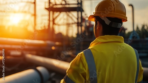 Construction worker overseeing operations at sunset in industrial site high-quality image outdoor environment focused perspective