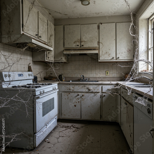 Kitchen. The corner of the kitchen is covered in cobwebs (they haven't cooked in a while), isolated, white background.