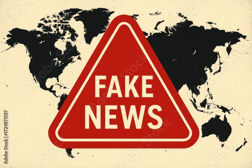 Red triangular warning sign with FAKE NEWS text superimposed over a black and beige world map fake news