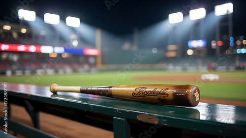 Baseball bat resting on a dugout bench under stadium lights, ready for a game.