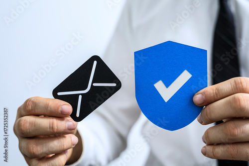 Image depicting secure email concept. Businessperson holds icons representing email and security.