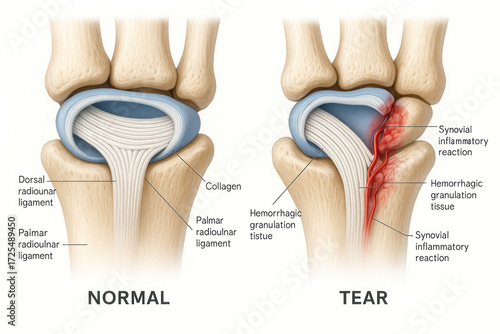 Medical illustration comparing a normal wrist ligament to a torn wrist ligament, showing inflammation and granulation tissue.