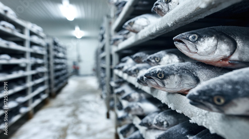 Frozen fish neatly arranged on shelves inside industrial cold storage facility with frost covered surfaces