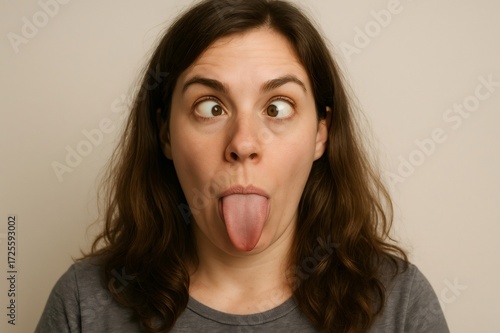 Playful young woman crossing her eyes and sticking out her tongue, creating a humorous and silly facial expression filled with joy