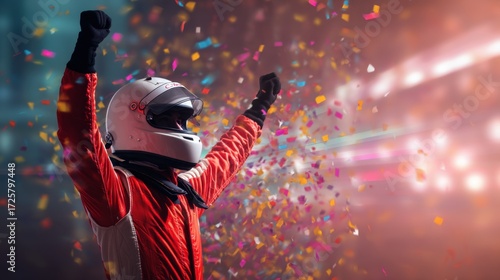 Male car racer with helmet raises arm in victory at celebration. Motorsport winner happy in confetti.