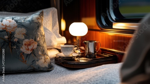 Cozy luxury train cabin with tea set, lamp, and floral pillow in warm light