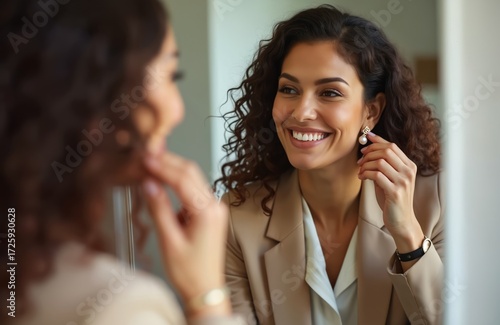 Businesswoman smiles while putting pearl earring in her ear, preparing for work. She looks in mirror, checking appearance. Elegant, confident female in business wear gets dressed indoors.