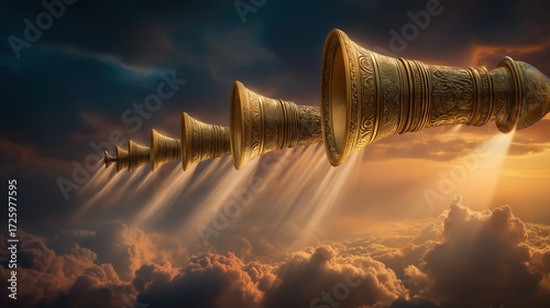 The seven trumpets of Revelation. Majestic golden trumpets glowing in the heavens, symbol of divine judgment, prophecy, and the glory of God.
