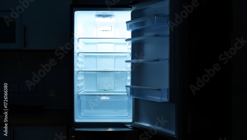 An open and empty refrigerator glows with internal light in a dimly lit, quiet kitchen setting.