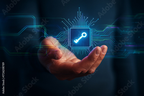 AI generated hand holding glowing holographic microchip with key icon symbolizing cybersecurity encryption data protection and futuristic digital network security