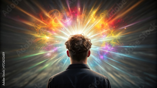 Neurodiversity concept ,young person with radiant colorful creative explosion from head expressing imagination and wonder