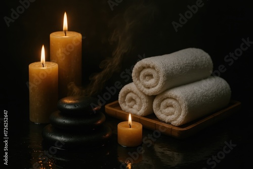 Serene zen spa sanctuary with flickering candles steam and dark stone textures creating a moody wellness ambiance on a dramatic charcoal backdrop
