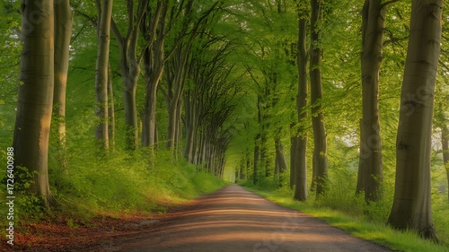 Straight dirt road lined with lush green trees in a sun-dappled forest path