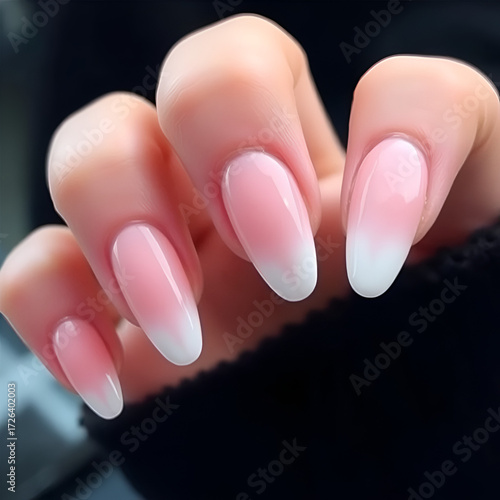 Elegant long almond-shaped nails with a gradient ombre finish, showcasing meticulous cuticle grooming and a polished shine, perfect for nail care.