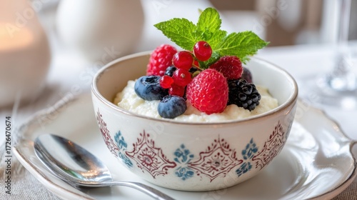 russian tvorog dessert close up, sweetened cottage cheese, berries garnish, elegant bowl, fine dining style