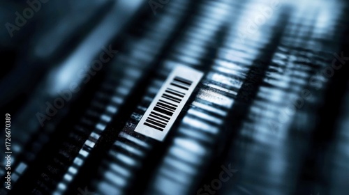 Close-up barcode label with abstract blue light reflections on metallic surface, symbolizing technology, commerce, data, and identification.