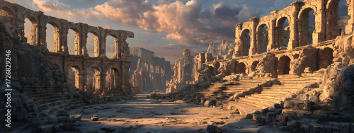 Sunlit ancient amphitheater ruins of a ruined coliseum, with arches casting shadows and clouds in the epic sky of a warm day with sun. Scene of gladiators and Roman circus.