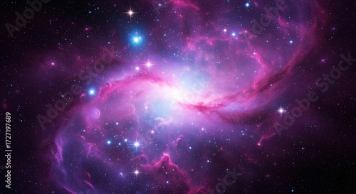 Colorful Galaxy and Nebula. A captivating cosmic scene depicting a galaxy and nebula painted in shades of purple, pink, and blue, with a burst of bright light at the center and scattered stars