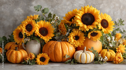 Jesienna kompozycja z jaskrawo pomarańczowymi dyniami i dużymi, żółtymi słonecznikami w wazonach na szarym, teksturalnym tle.