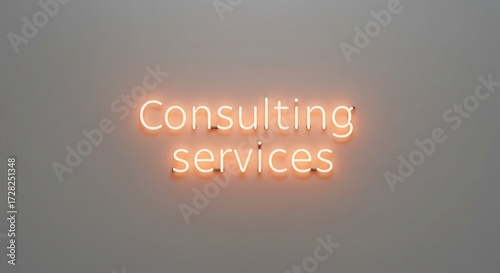 Illuminated neon sign glows with the words 'Consulting services' casting a warm orange light on a neutral background, perfect for business branding and professional services.