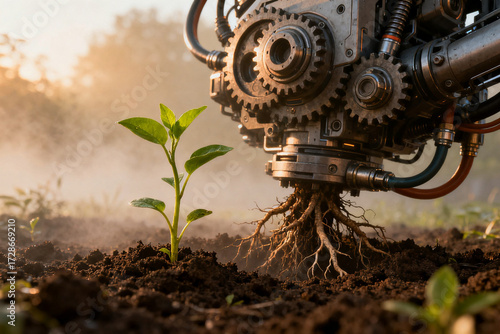 Mechanical device with roots growing into soil beside a young plant in a natural setting