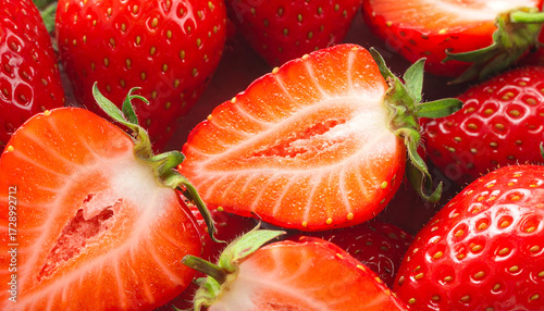 フルーツの甘酸っぱさを伝える新鮮なイチゴの断面を鮮明に捉えた瑞々しい構図