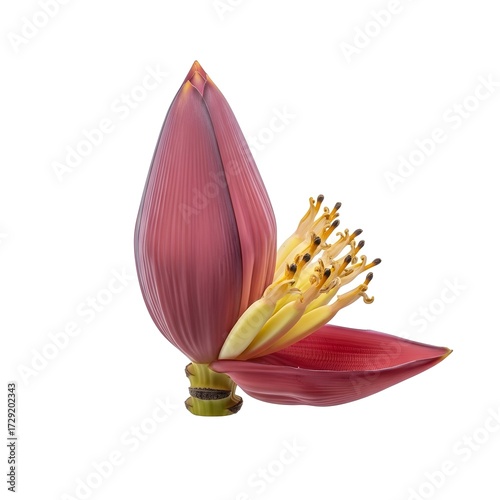Close up of a vibrant red banana flower bud with yellow stamens isolated on white background