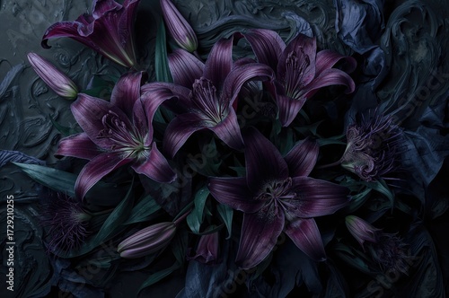 Abstract bouquet of fresh buds and foliage with dark lilies on a deep background