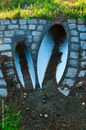 Kamienny przepust odwadniający pod drogą z niebieskimi rurami drenażowymi wystającymi z ziemi spod trawy i żwiru, tworząc miejską infrastrukturę wtapiającą się w naturę.