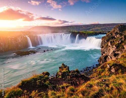 A majestic waterfall cascades over dark rocks into a turquoise river at sunset