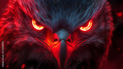 Detailed digital illustration of an eagle's head and upper chest, exhibiting intense, glowing red eyes, and sharp focus. The image has dark tones and vibrant red highlights.