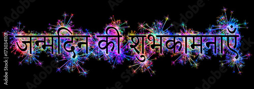 Kolorowe zimne ognie i fajerwerki układające się w kształt słów i życzeń: जन्मदिन की शुभकामनाएँ ( HAPPY BIRTHDAY ) w języku hindi.