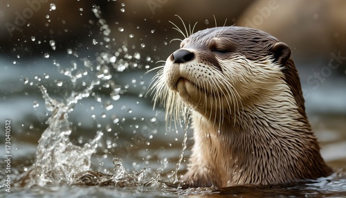 a playful river otter emerges from the water, water droplets suspended in mid-air around its whiskered face.