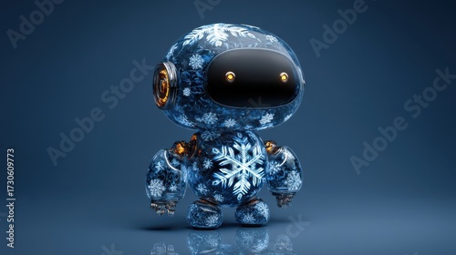 A charming robot adorned with snowflake patterns, showcasing a glossy blue finish and bright eyes, embodying a winter-themed design, cute Christmas robot
