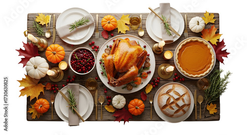 A festive Thanksgiving dinner spread with a roasted turkey, pumpkin pie, cranberry sauce, and seasonal decorations on a rustic wooden table