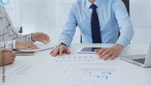 Business people analyzing financial charts, graphs on tablet and laptop, collaborating closely during strategic planning session in office