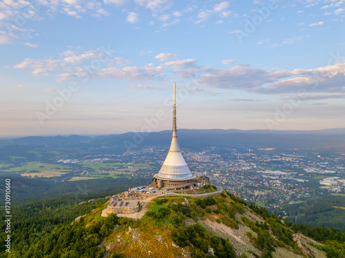 Jested Mountain Hotel glows in the evening light, perched atop a hill in Liberec. This modern architectural marvel stands as a TV transmitter, offering panoramic views of the landscape.