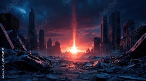 Dramatic post-apocalyptic cityscape at sunset with fiery explosion, ideal for sci-fi and disaster concepts.