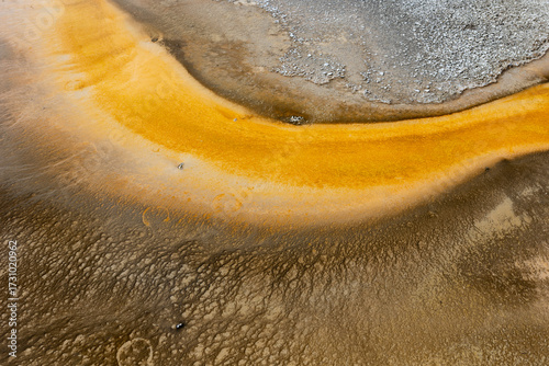Stunning aerial view of vibrant yellow river winding through textured earth, creating a natural abstract landscape with unique geological formations