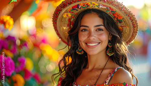 A beautiful, smiling woman wearing a colorful straw sombrero and festive earrings, with a vibrant, blurred background of flowers and decorations, evoking a lively cultural celebration.
